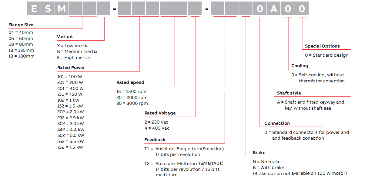 ESM系列伺服電機(jī)用于高動(dòng)態(tài)精度的運(yùn)動(dòng)控制由于其轉(zhuǎn)矩密度高,ESM系列伺服電機(jī)具有高動(dòng)態(tài)響應(yīng)。單圈和多圈高分辨率值編碼器反饋可選件可匹配應(yīng)用要求。ESM系列電機(jī)外殼符合IP65防護(hù)等級(jí)。額定功率從0.1kW至7.5kW,五個(gè)標(biāo)準(zhǔn)的框架法蘭尺寸為40,60,80,130和180毫米,可添加制動(dòng)可選件??蚣?0-80法蘭的電機(jī)提供引出線,方便電機(jī)動(dòng)力和反饋的連接。